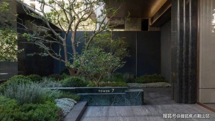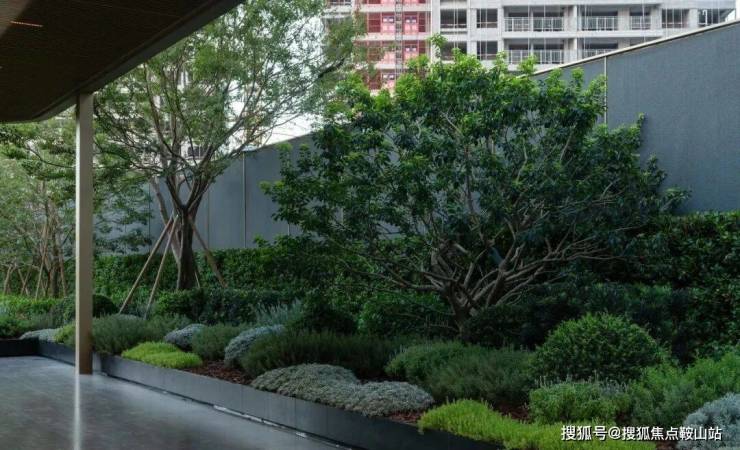对景的雪花绿大理石景墙后孤植一颗优美斜飘姿态的冬青做点缀,景墙前搭配绿色系素雅自然的花境,通过植物以柔克刚为整个场地增添了细腻温润的质感。