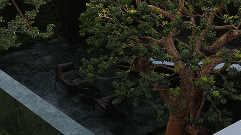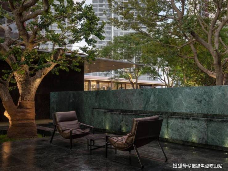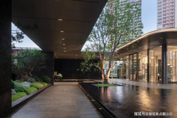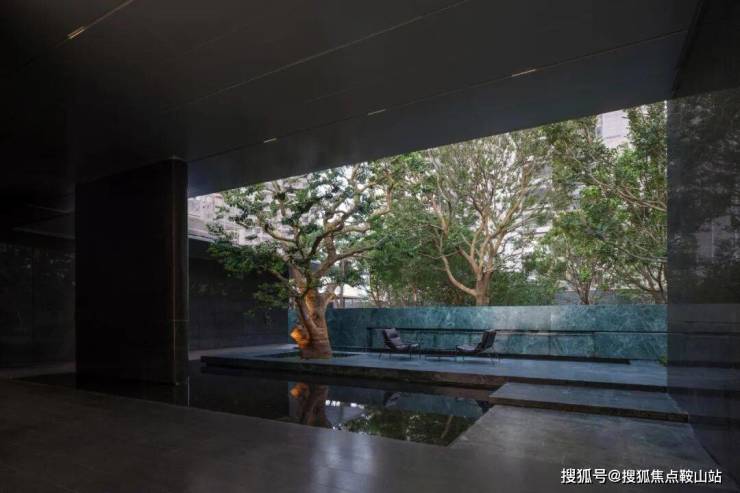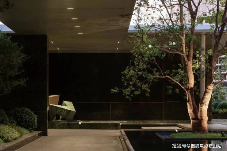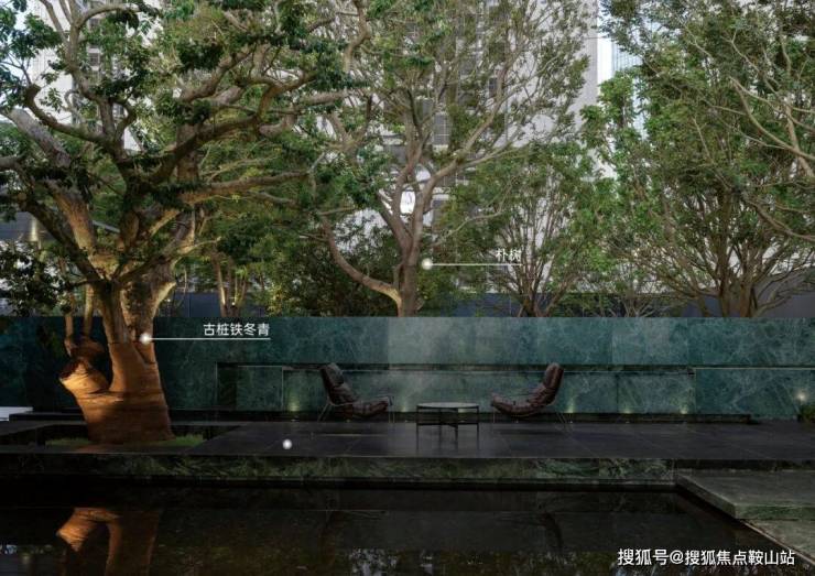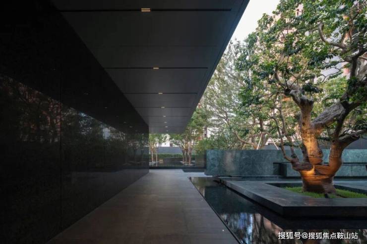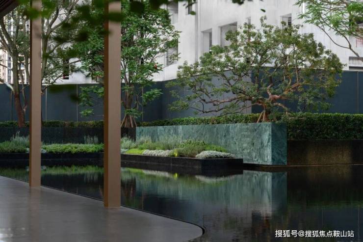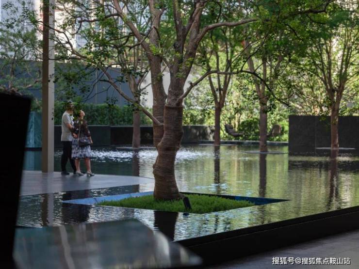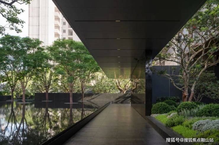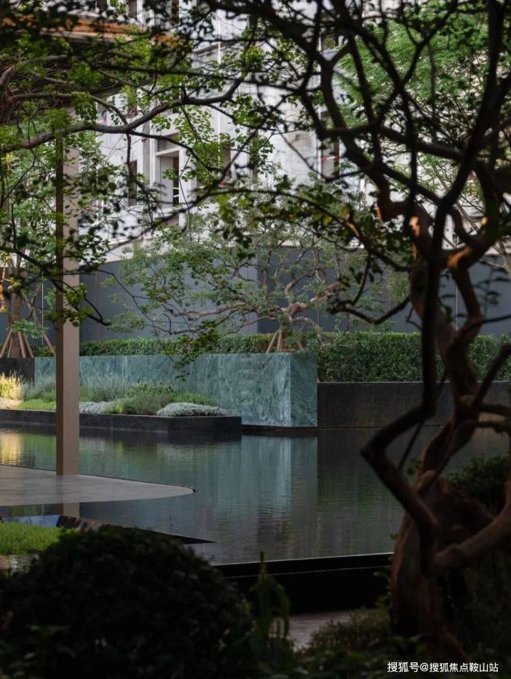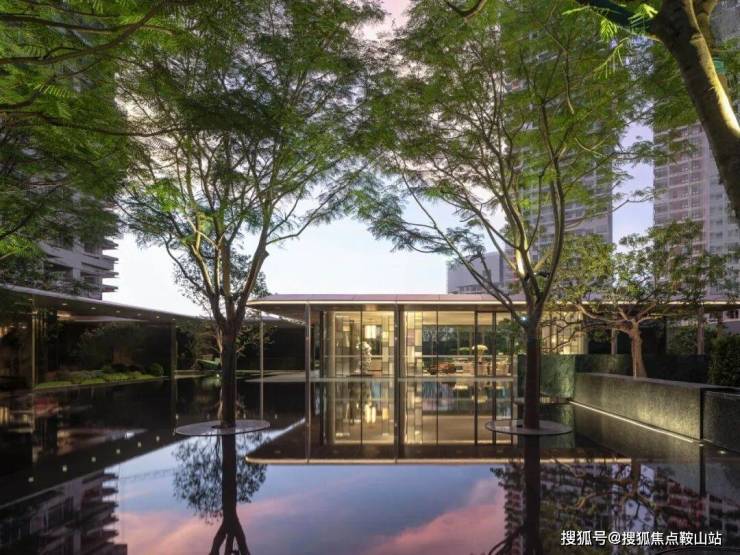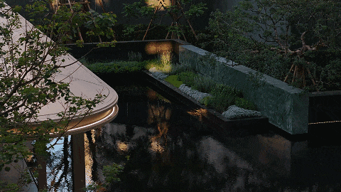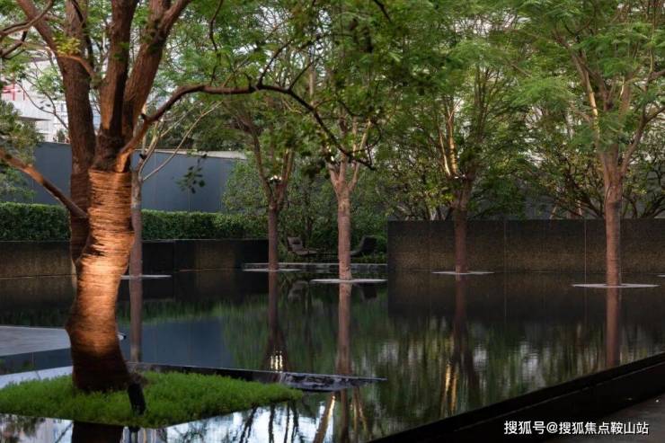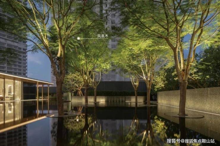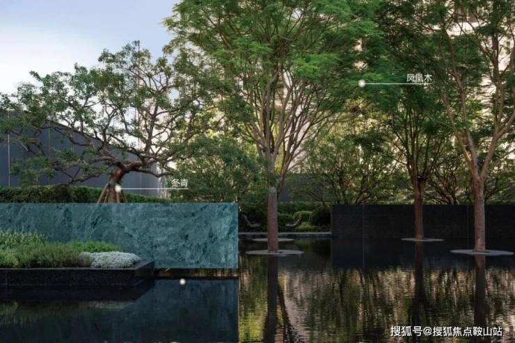 主景树选用凤凰木,阵列植栽,树形向上打开,视觉上体现了向天空伸展延伸的感觉,寓意勃勃向上的生命力,斑驳的树影倒映在大面积镜面水景中,与对景的山水厅呼应,又给人以优雅宁静之感。