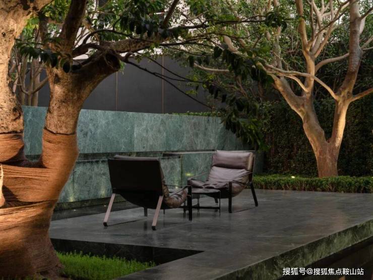 休憩区融入森林景象的生活场景,背景搭配大面积朴树,厚重感的古桩铁冬青作为点睛之笔耸立在左侧,呈现出诗意的画框感,植物带来了空间的层次感与延续性,随着树影微妙变幻,让人如同漫游“森林剧场”,一角小憩,拥抱舒适,释放疲惫。