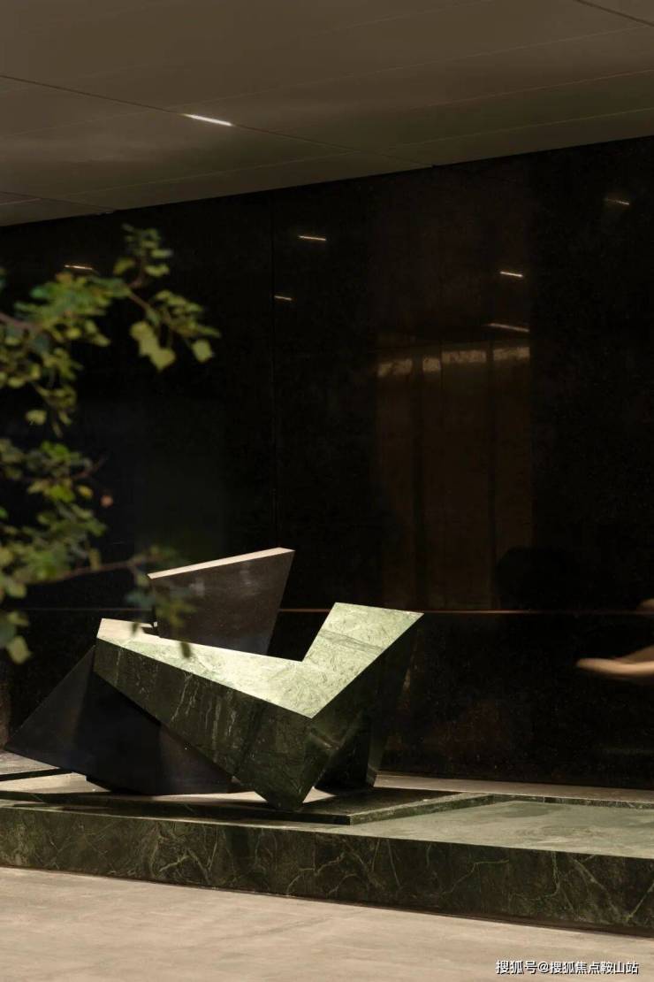 通廊尽头右侧点缀一棵婀娜多姿的乌桕,自由开展的枝桠呈现出一丝野趣和放松,不追求厚重的粗壮型树种,反而将整体空间的尺度恰到好处。通廊的轻盈通透,背景山水厅若隐若现,搭配尽头的艺术雕塑,光影流转,举头赏静,宛若一幅温暖而宁静的画卷。