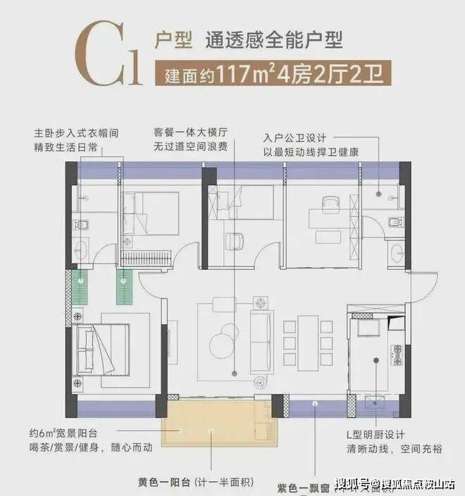 建面约117㎡横厅4房2厅2卫,与116㎡同个面积在横厅设计,自然是可以满足南北通透的需求。