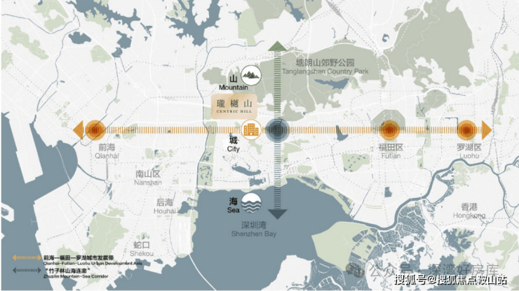 ①中心区域:深圳山海城中轴,左手香蜜湖、右手华侨城,六大总部基地环伺