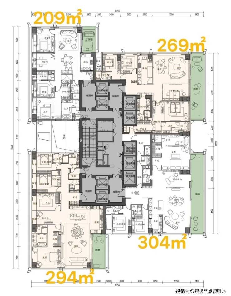 【户型面积】低区209-294-269-304㎡,高区370-375-403㎡,超高区500平-700平-1050㎡