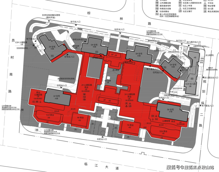 3,配建巨量底商(红色部分),未来极有可能打造成为会所,顶部承担屋顶花园功能。与其他项目不同的地方在于,其他项目会所往往环绕住宅分布,保利面粉厂项目的会所则渗透全盘