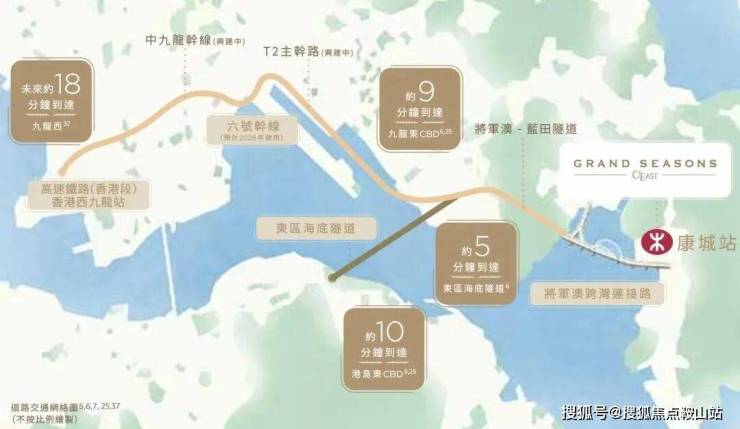 由将军澳跨湾大桥连接蓝田隧道,可直达东区海底隧道及九龙区干道。未来T2主干线开通后,驾车出入启德至九龙站一带仅需时约15分钟。