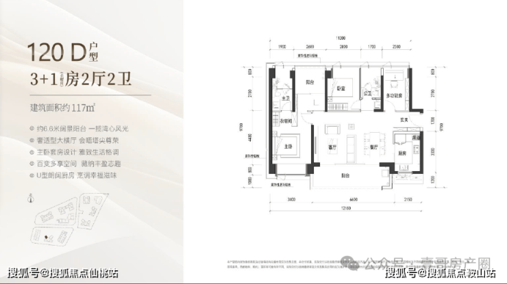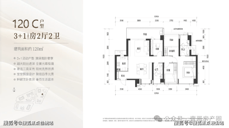 户型为大三房两厅两卫,东南朝向,含赠送半,阳台和飘窗等平台部分后使用率可达约 88%左右,这在超高层中是非常高的使用率。其中主客卧、客厅、双阳台合计开间超 12m,大尺度四面宽朝南,带约 6.15 米奢阔观景台,堪比一线豪宅的观景尺度;主卧超奢阔大套房,且预留了室内后期业主自行改造的灵动空间,