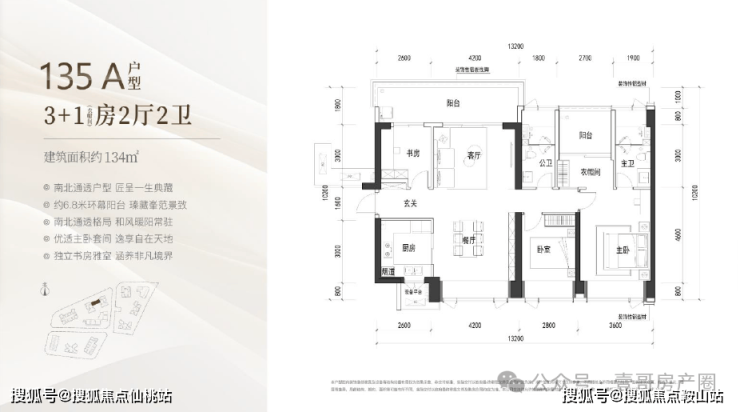 经典的双龙抱珠布局,主人空间与客卧空间互不干扰,具备私密性优势。并且户型方正,实用三房两厅两卫。朝南向四开间面宽共约 13.2m,全明空间,采光极佳。这个户型含赠送半阳台和飘窗的面积后使用率可达约 83%,这在超高层中是比较高的使用率。