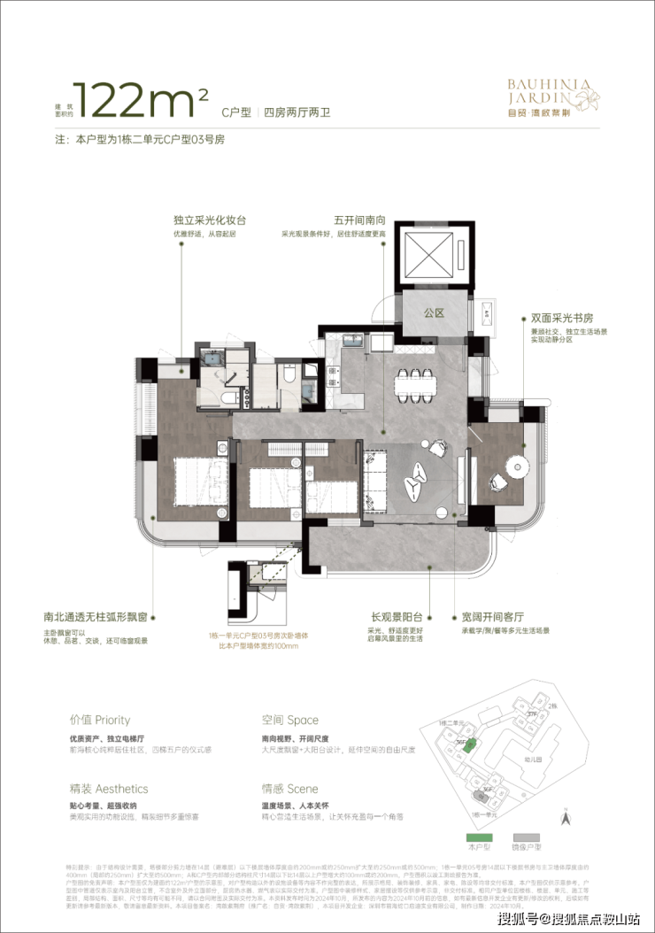 双龙抱珠户型,整个户型非常通透。书房分布于客厅另一侧,难得的双面采光+270°景观视野。主卧南北通透,景观面开阔。
