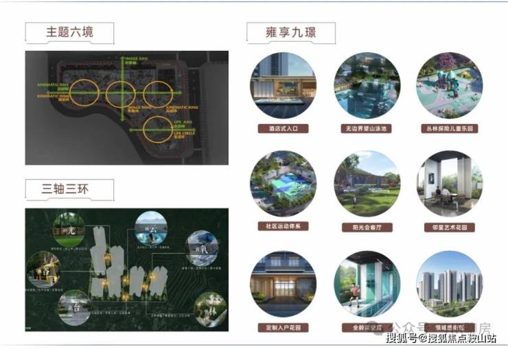 景观园林以“借山还山,师法自然”为设计理念,以“三轴三环”为结构,以”六境九璟“为核心景观主题,打造约2万㎡全龄乐活生态公园。
