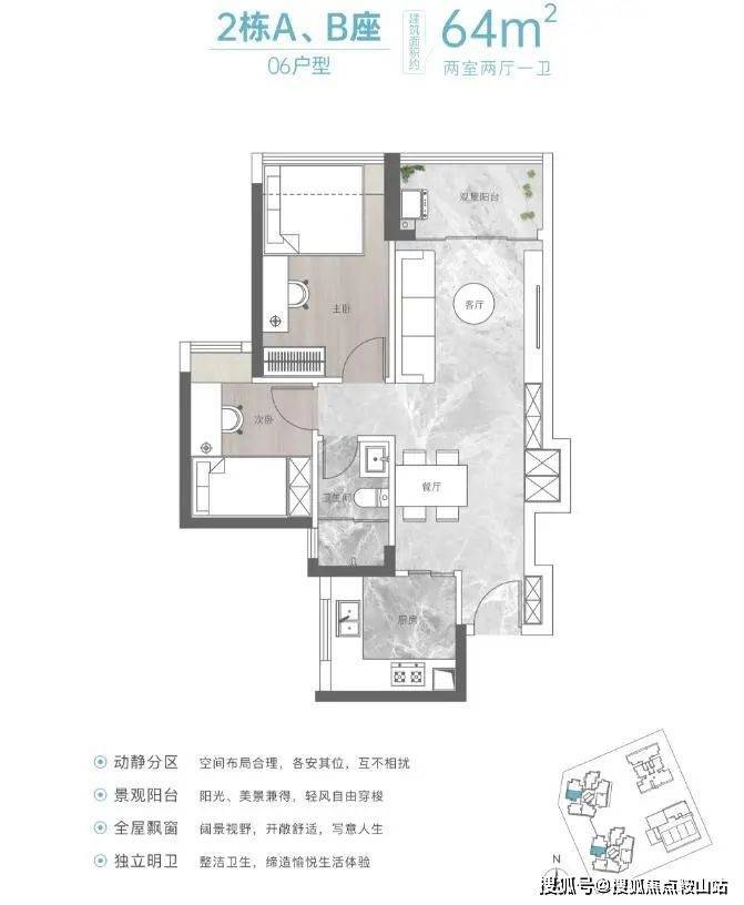 ②建面约64㎡是竖厅的两房两厅一卫户型,对比那个54㎡的户型,这个功能间布局就传统多了,多了10个㎡,同样也具有低总价优势。