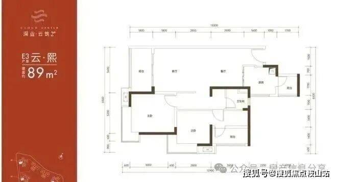 89㎡的3房2厅1卫,E2户型,设计的是竖厅格局,客厅3.6米开,3个卧室分别做到了主卧13.5㎡/次卧9.54㎡/次卧8.1㎡(含墙体飘窗),厨房带1个小生活阳台,得房率:79.89%(不含赠送),东南/西南或正南朝向。