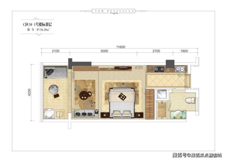 康养酒店户型:一房一厅一卫,建面58.29平米。
