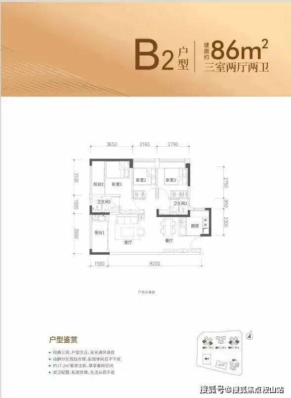 86㎡的3房2厅2卫,设计的是竖厅格局,客厅3.5米开间,进深8.2米,LDKB一体化设计,三开间朝南,3个卧室分别做到了主卧14.76㎡/次卧9.06㎡/次卧7.02㎡(包含墙体飘窗),U型厨房,公卫三段式分离,得房率约88.08%(包含赠送),东南或西南朝向。