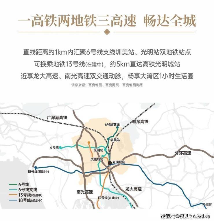 直线距离约1km内汇聚6号线支线圳美站、光明站双地铁站点,可换乘地铁13号线(在建中),约5km直达高铁光明城站,近享龙大高速、南光高速双交通动脉,畅享大湾区1小时生活圈。