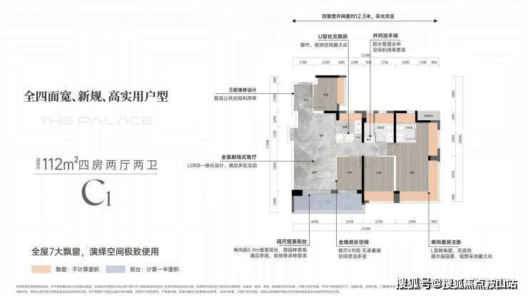 户型面积布局C1112平四房两厅两卫设计的是经典竖厅格局,客厅3.65米开间,LDKB一体化,S墙设计预留双开门冰箱位,四面宽开间面约12.3米,动静分区,四开间朝南,主卧270°无柱转角飘窗,分别做到了主卧22.95m²/次卧10.39m²/次卧7.9m²/次卧6.86m²(包含墙体飘窗),U型厨房,卫生间干湿分离,客厅连接次卧5.9米长的观景大阳台10.62m²东南朝向,看小区园林景观。户型亮点亮点1:客厅与相邻房间之间,餐厅与厨房之间均无剪力墙,提供大方厅的可能性,主卧与相邻房间之间无剪力墙,提供房间合并的灵活性。