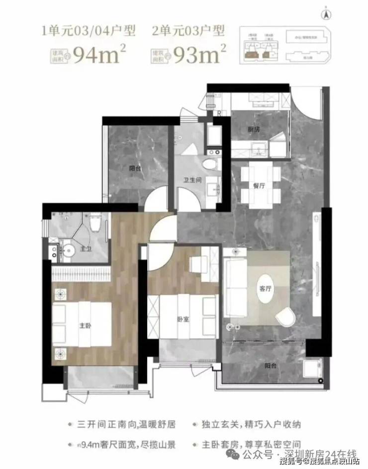 93-94㎡的3房2厅2卫,1栋1单元03、04户型/1栋2单元03户型,设计的是经典竖厅格局,客厅3.6米开间,LDKB一体化设计,动静分区,三开间朝南,9.4米面宽,二字型厨房,卫生间干湿分离,阳台正南朝向。