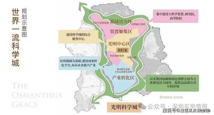 光明布局规划“一心两区”,“一心”即光明中心区,建设科学城的生活服务中心,集聚商业、居住、大型公共服务设施等顶级配套。