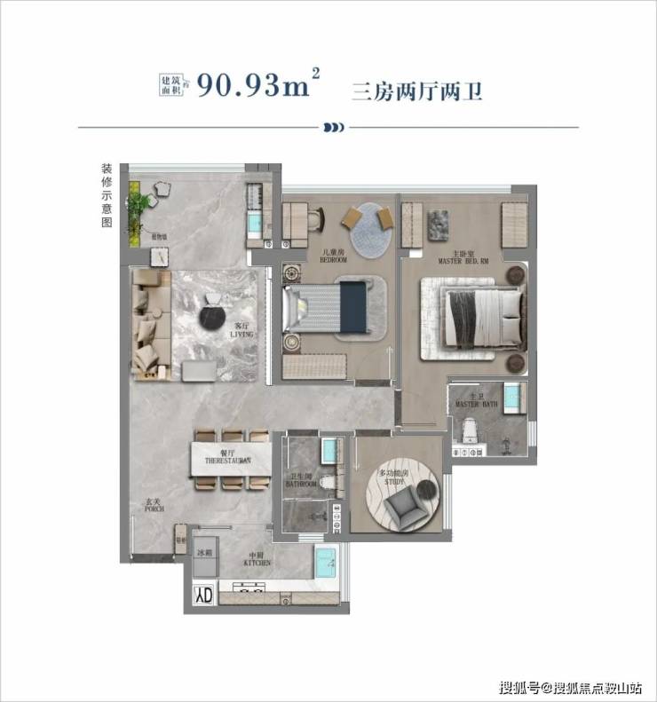 90.93㎡ 2+1房两厅两卫