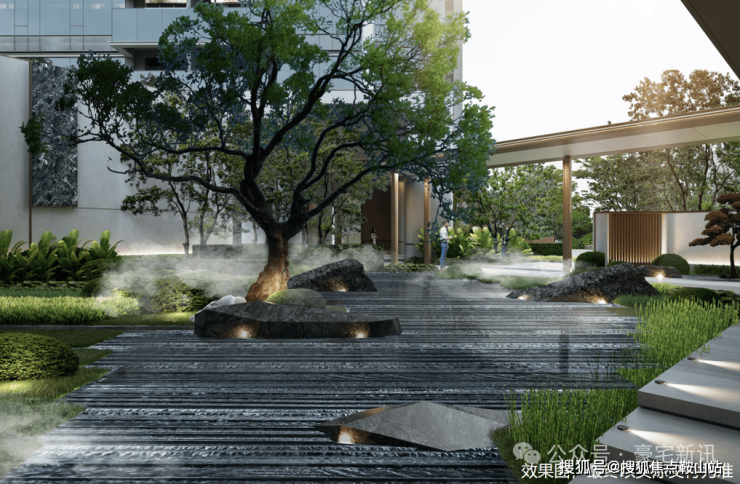 石材景墙+艺术水景+小叶紫檀组景,豪宅级归家体验。
