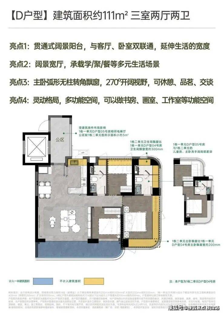 湾啟紫荆位于前海妈湾听海大道,占地约1.5万㎡,住宅建面约6.6万㎡,容积率5.14,共有三栋住宅组成,层高36-37F,共485户,车位595个,车位比1.1.2,4梯5户,主推约96㎡稀缺三房、111㎡3+1房、122㎡四房、142㎡四房。户型设计了大客厅、宽景阳台、阔景飘窗等,拥有山海河多重景观资源,计划品质精装交付。户型采用建筑新规设计,户户大阳台,4梯5户,分布式电梯设计,独立电梯厅。