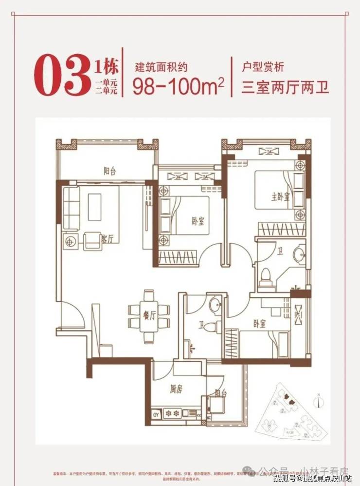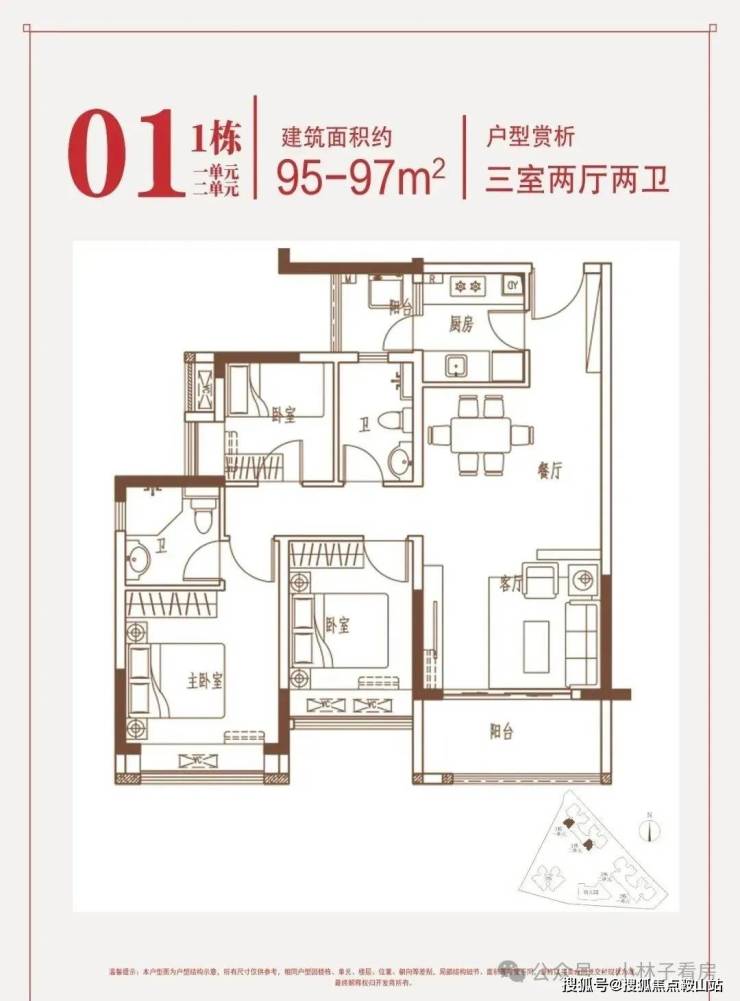 约95-97㎡三房:南向端头位,三面采光,花园瞰景。