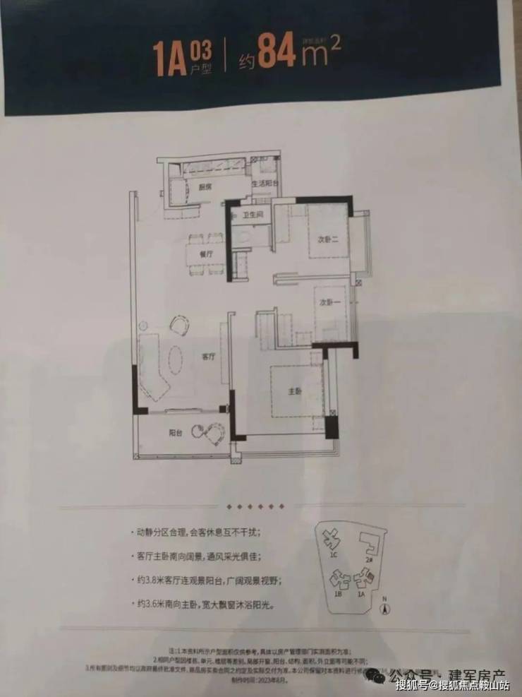 84㎡的3房2厅1卫(1栋A座03户型),设计的是竖厅格局,客厅3.6米开间,动静分区,一字型型厨房,还带1个小生活阳台,卫生间三段式分离设计,得房率:79.62%(不含赠送),阳台东南朝向。