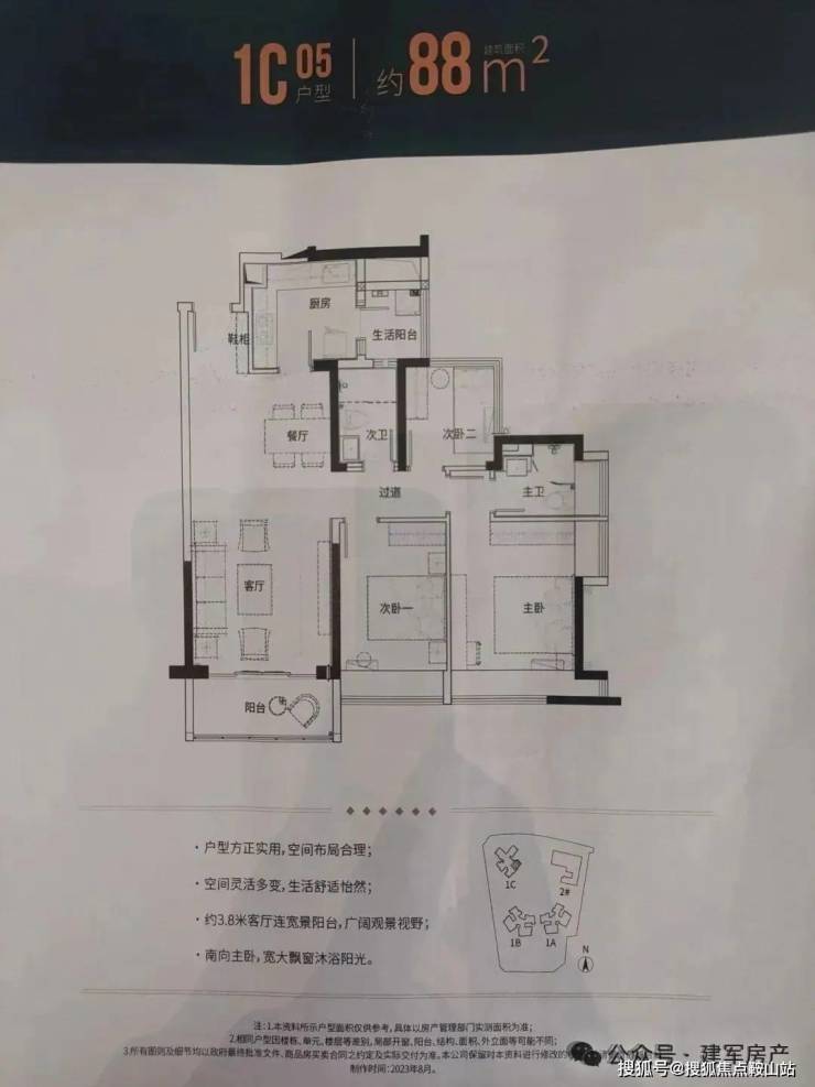 88㎡的3房2厅2卫(1栋C座05户型),设计的是竖厅格局,客厅3.8米开间,动静分区,三开间朝南,主卧大套间设计,L型厨房,还带1个生活阳台,得房率:77.27%(不含赠送),阳台东南朝向。