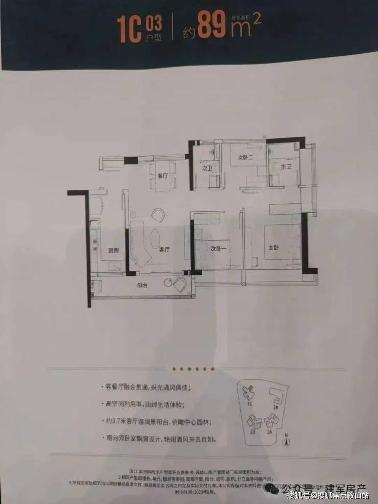 89㎡的3房2厅2卫(1栋C座03户型),设计的是竖厅南北通透格局,客厅3.6米开间,动静分区,主卧大套间设计,超大L型厨房,得房率:77.27%(不含赠送),阳台主朝东南向。