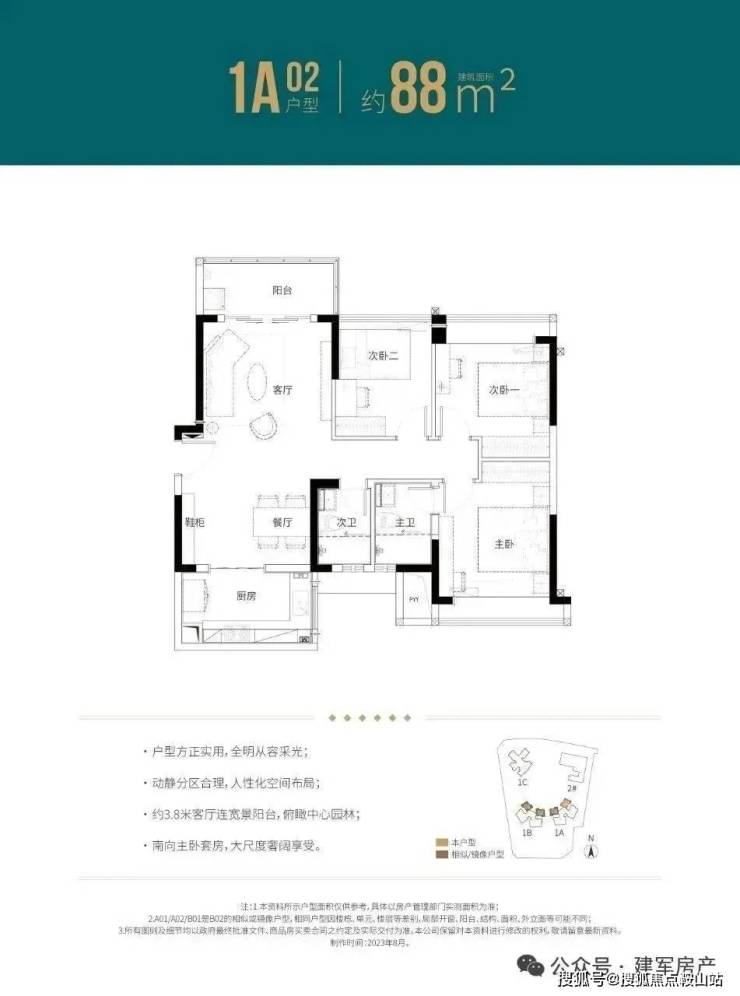 88㎡的3房2厅2卫(1栋A/B座01.02户型),设计的是竖厅南北通透格局,客厅3.8米开间,动静分区,主卧大套间设计,U型厨房,得房率:79.61%(不含赠送),阳台主朝西北向。