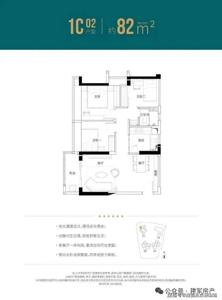 82㎡的3房2厅1卫(1栋C座01户型),设计的是竖厅南北通透格局,客厅3.6米开间,三开间朝南,动静分区,L型厨房,得房率:77.27%(不含赠送),阳台西南朝向。