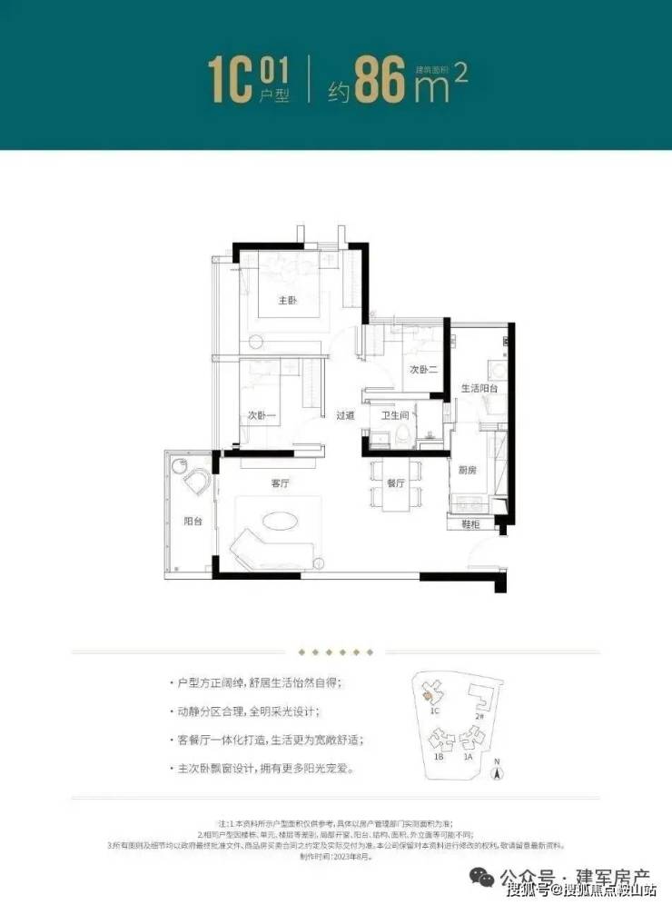 86㎡的3房2厅1卫(1栋C座01户型),设计的是竖厅格局,客厅3.6米开间,动静分区,三开间朝南,L型厨房,还带1个生活阳台,得房率:77.27%(不含赠送),阳台西南朝向。
