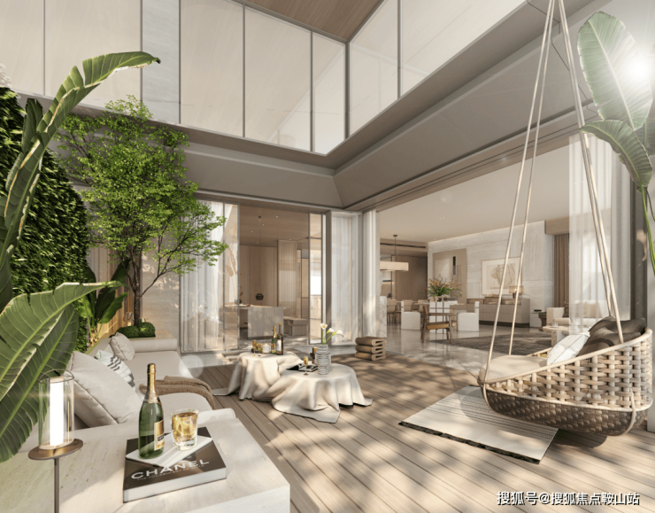第一,近6米挑高的超大院落。既扩大了阳光的斜射照射面积,使得室内光线更加柔和而明亮,更在无形中增强了空间的奢华感。
