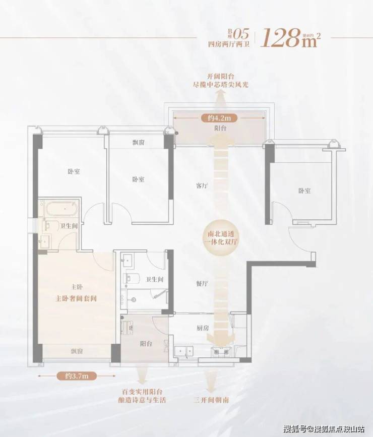 天宸128㎡户型图,双卫浴、双阳台设计,主卧大套房,空间开阔。