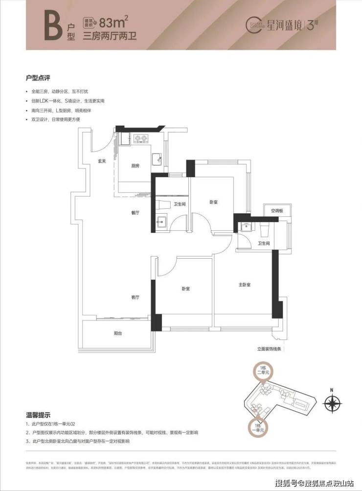 83㎡的3房2厅2卫(1栋1单元01/02户型),设计的是竖厅格局,创新LDK一体化餐客厅,S墙设计预留冰箱位,三开间朝南,次卧270度环幕设计,U型厨房,卫生间干湿分离,得房率80.07%(不含赠送),全部西南朝向。