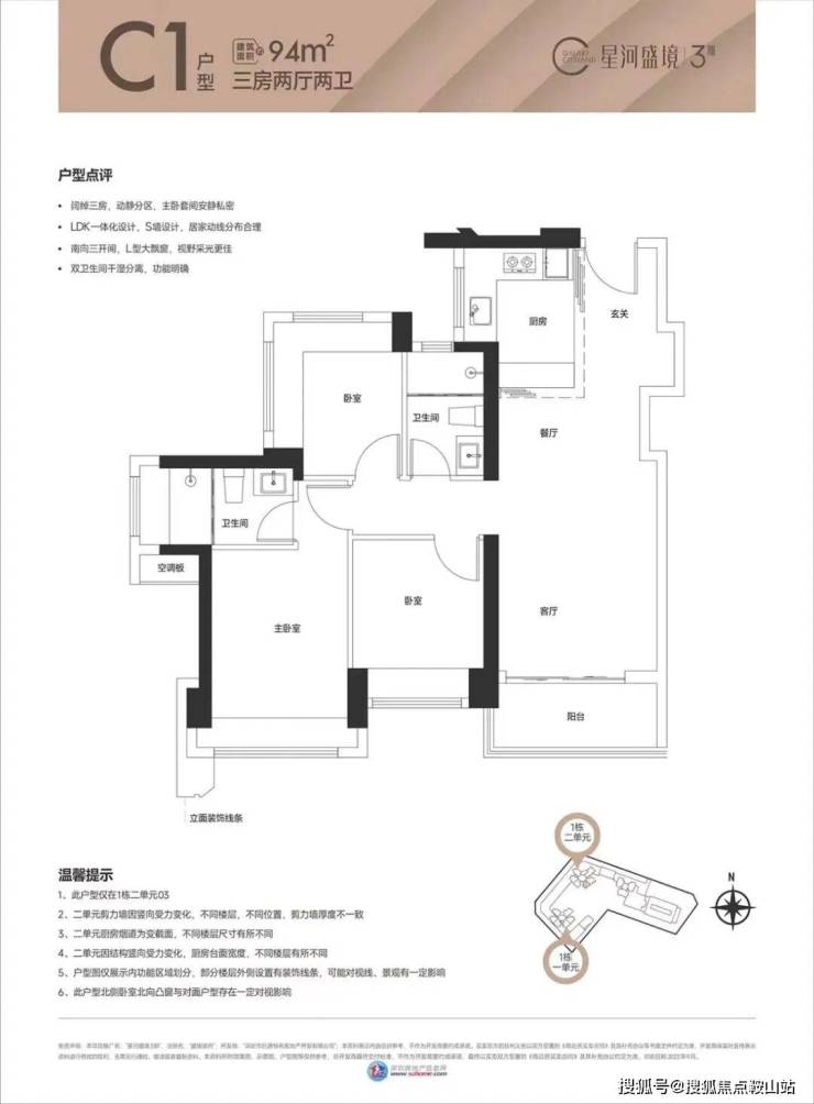 94㎡的3房2厅2卫(1栋2单元06户型),设计的是竖厅南北通透格局,全屋飘窗设计,主卧南北通透双飘窗,U型厨房,卫生间干湿分离,得房率76%(不含赠送),阳台主朝东北向。