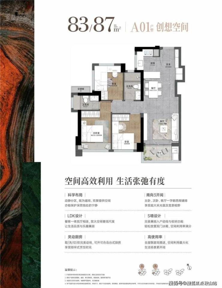 83-87平:3房2厅2卫,套内净使用率在80%,西南朝向