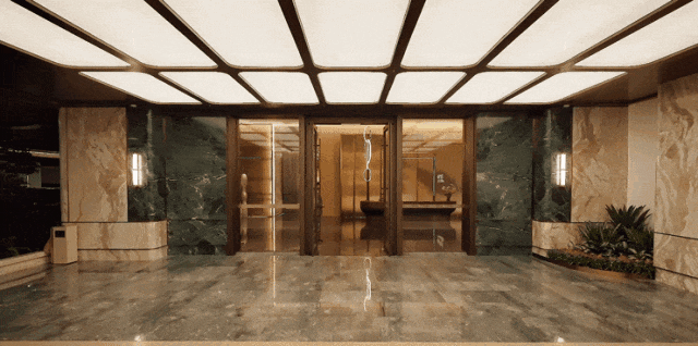 主入户大堂:约11米层高、450㎡,双大堂设计:主仆分流,电梯厅高定石材+金属格栅。
