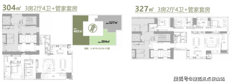 项目推出的304㎡、327㎡、402㎡三大主力户型,还有规划的568-1032㎡定制大平层/复式与35栋商墅,适配家族居住、企业总部接待等多元需求。户型设计以多套间、家政套间、高得房率的特质,重新诠释顶豪的居住本质。
