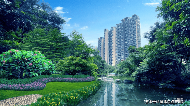 项目内部打造了一条沿着台地蜿蜒的溪流,该水系为市面罕见的活水溪流,贯穿整个社区园林,依据溪岸的曲直不同和地形变化,打造叠水、溪流、瀑布、水潭等多样特色水景,溪岸植物种类繁多,与水流互为风景,沿岸专门设置不同的亲水平台,营造自然灵动的栖心之境。
