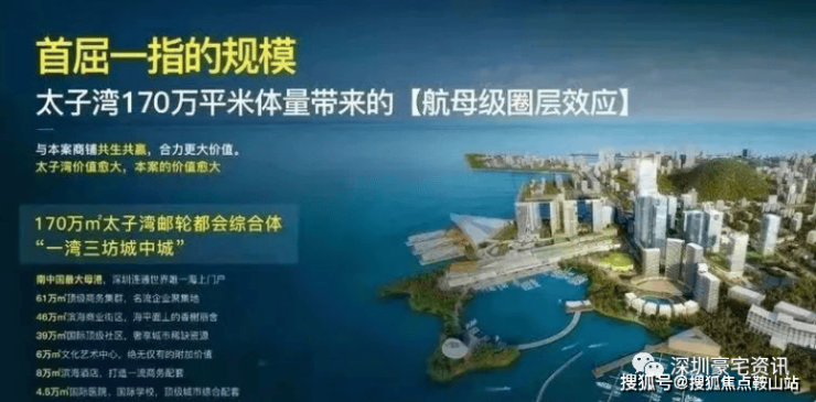 此外还规划有五星级酒店(2座)、国际学校(蛇口共7所)和目前深圳唯一的国际高端康养机构(招商力宝)。太子湾的整体打造将以结合山海资源为基础打造成以国际邮轮母港、高端商务平台、滨海休闲岸线、国际交通枢纽四大功能体系为主的大型城市综合体。