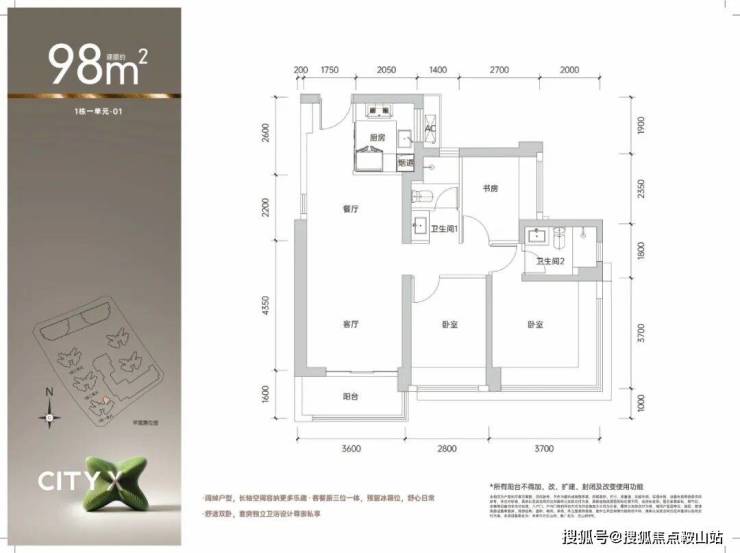 98㎡的3房2厅2卫,1栋1单元01户型,设计的是经典竖厅格局,进门入户玄关,客厅3.6米开间,LDKB一体化设计,动静分区,3个卧室分别做到了主卧14.3㎡/次卧10.36㎡/次卧6.75㎡(包含墙体飘窗),U型厨房,公卫三段式分离,得房率约75.4%(不含赠送),东北朝向。套内面积73.89㎡+赠送面积10.05㎡=实得83.94㎡,加上赠送后得房率约85.65%。还未推售