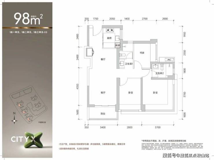 98㎡的3房2厅2卫,1栋1/2/3单元03.05户型/3栋的98平户型,设计的是经典竖厅格局,进门入户玄关,客厅3.4米开间,LDKB一体化,S墙设计预留冰箱卡槽位,三开间朝南,动静分区,3个卧室分别做到了主卧14.3㎡/次卧10.36㎡/次卧6.75㎡(包含墙体飘窗),U型厨房,公卫三段式分离,得房率约74.6-75.4%(不含赠送),东南或西南朝向。套内面积74.09㎡+赠送面积11.13㎡=实得85.22㎡,加上赠送后得房率约86.96%。