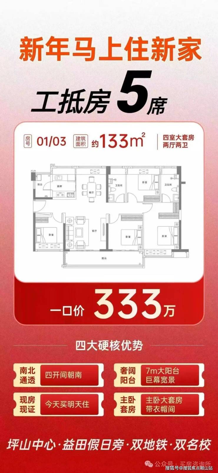 133㎡的4房2厅2卫,折后总价333万/套,单价2.5万/㎡