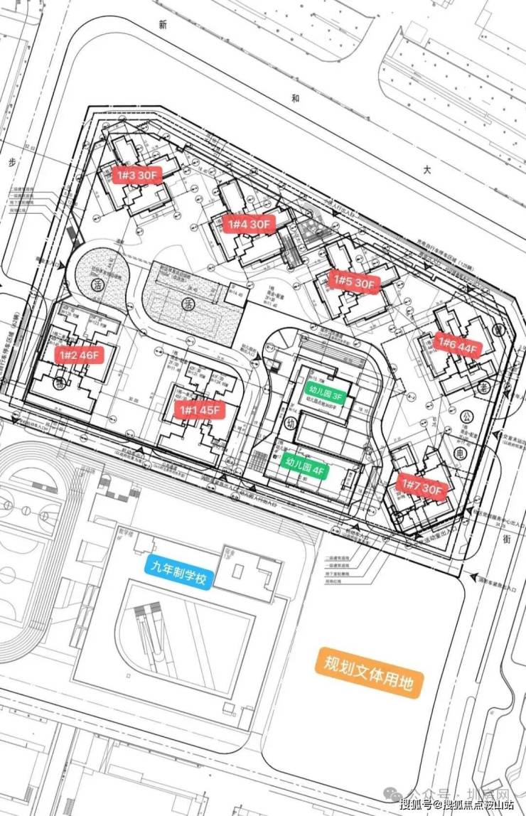从规划平面图看,项目由7栋30-46层高层住宅和1栋幼儿园以及2层的裙楼商业配套组成,普通住宅户数为1543户,停车位2002个(含充电桩车位601个)。