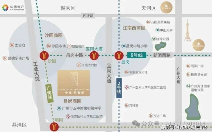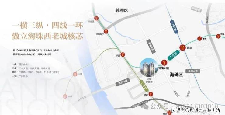 买房③要素,地段、地段、还是地段,项目位于海珠昌岗中路与宝岗大道交汇处,宝岗大道、工业大道、江南大道,海珠三大黄金走廊环绕。