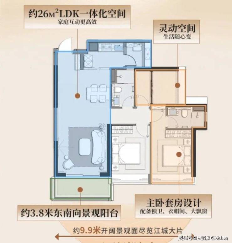 比如,采用少承重墙化设计,次卧可打通或隔开,生活阳台也能与厨房打通出7平全明空间。