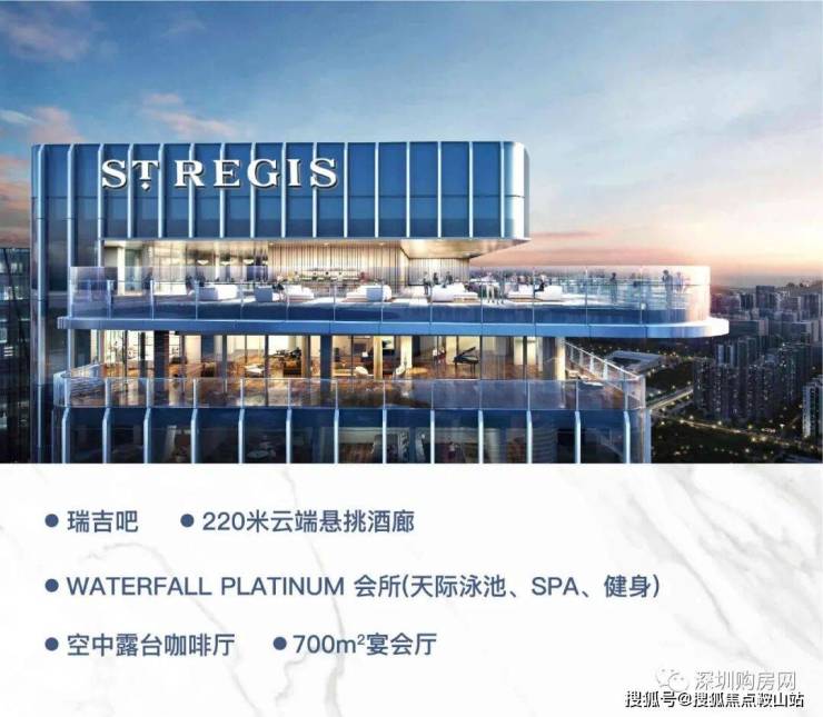 百年奢华瑞吉酒店,源自纽约1904年,从纽约到宝中的“精英400”传承,117年来遵循择址“首善之地”,秉持高水准服务。拥享深圳首个云端悬挑酒廊,于空中220米处,流淌微醺格调。