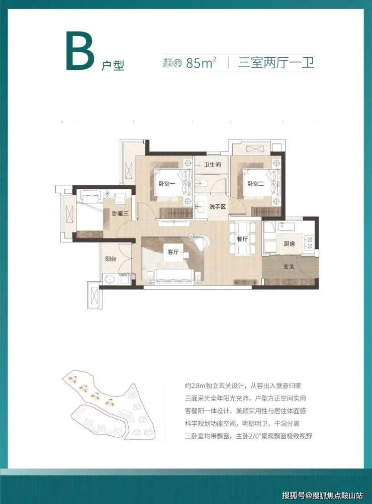 85㎡的3房2厅1卫,设计的是竖厅格局,餐客厅一体化设计,U型厨房,卫生间三段式分离设计,得房率:79.26%(不含赠送),阳台朝西南或东南向。