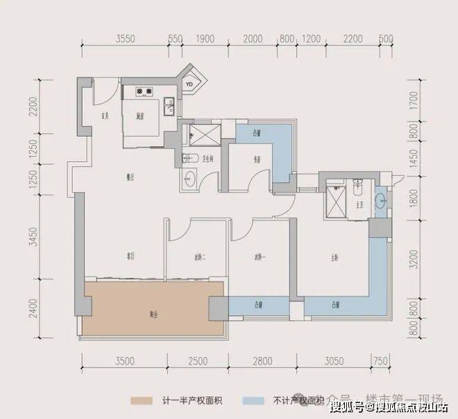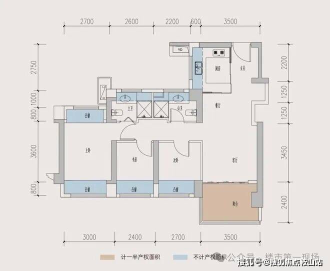 3房2厅2卫,西南向,竖厅格局,客厅3.5米宽,三开间朝南。主卧15.1㎡带270°飘窗。赠送面积16.96㎡,得房率96.84%(含赠送)