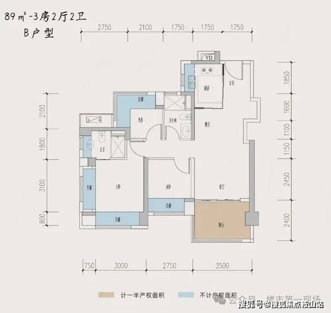 3室2厅2卫,东南向,竖厅设计,客厅3.5米宽,三间卧室朝南,卫生间干湿分离。赠送面积18.88㎡,得房率约98.29%(含赠送)。